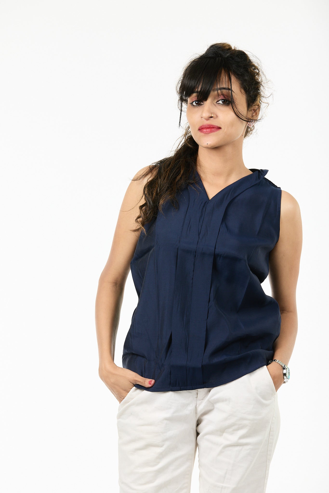 V-neck sleeveless design for a smart, airy silhouette
