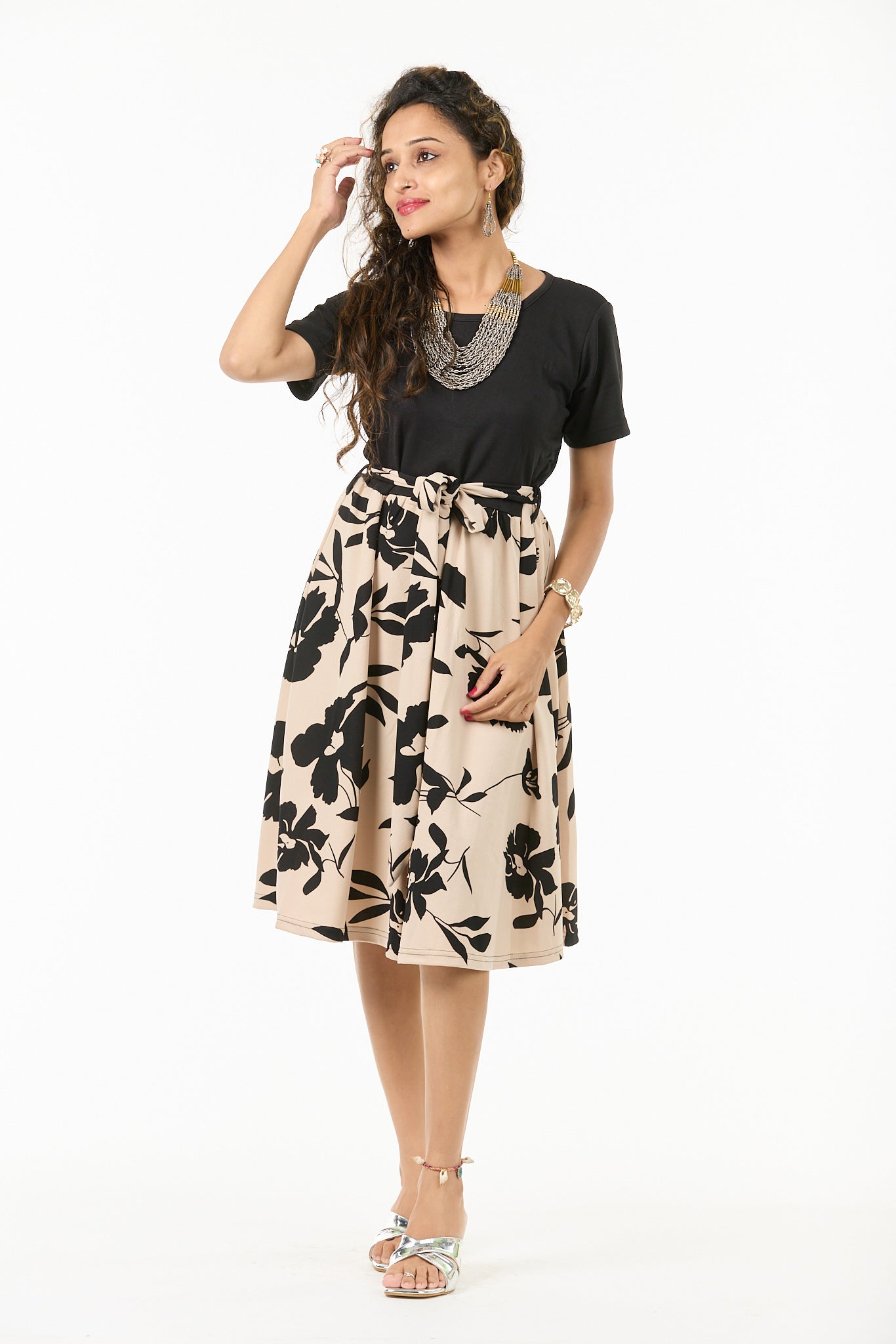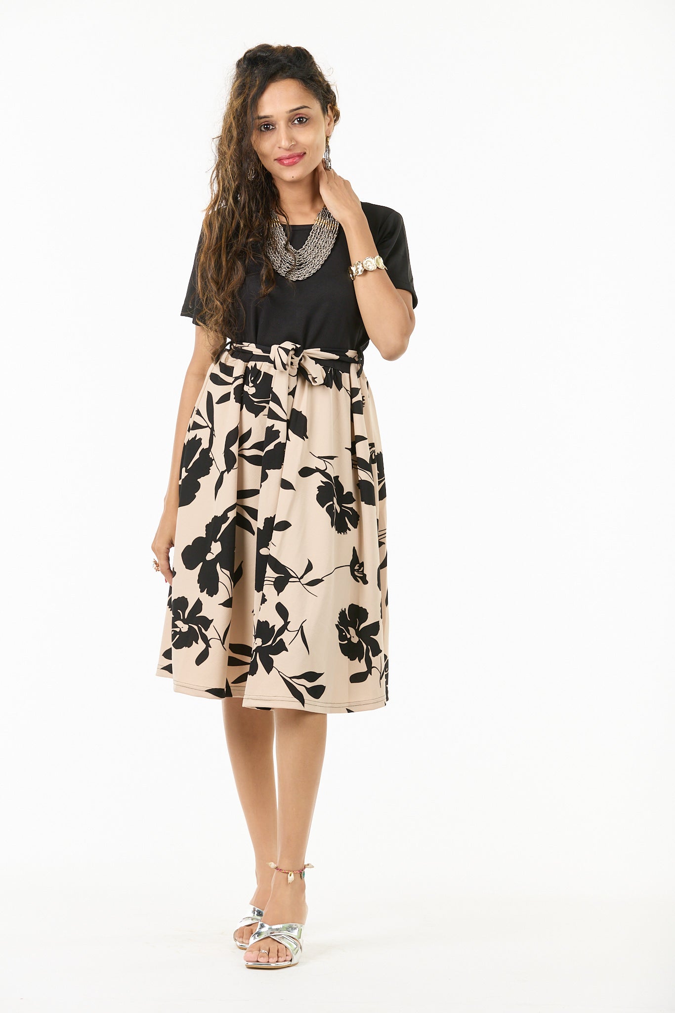 Style this dress with gold hoops and a sleek low bun — let the contrast of black and beige speak for your polished, confident charm.