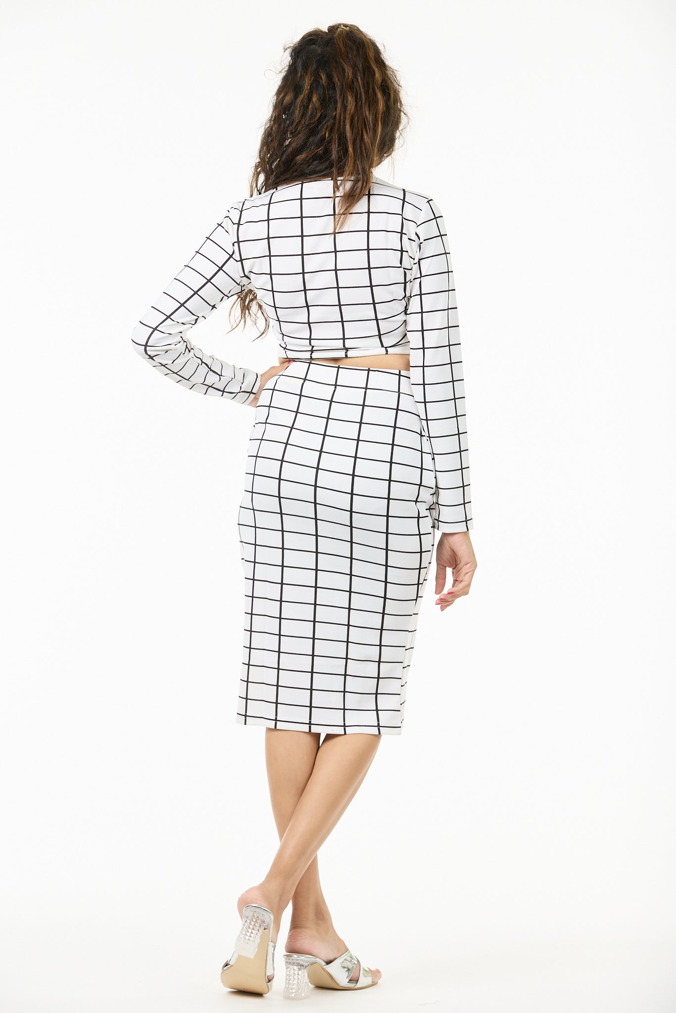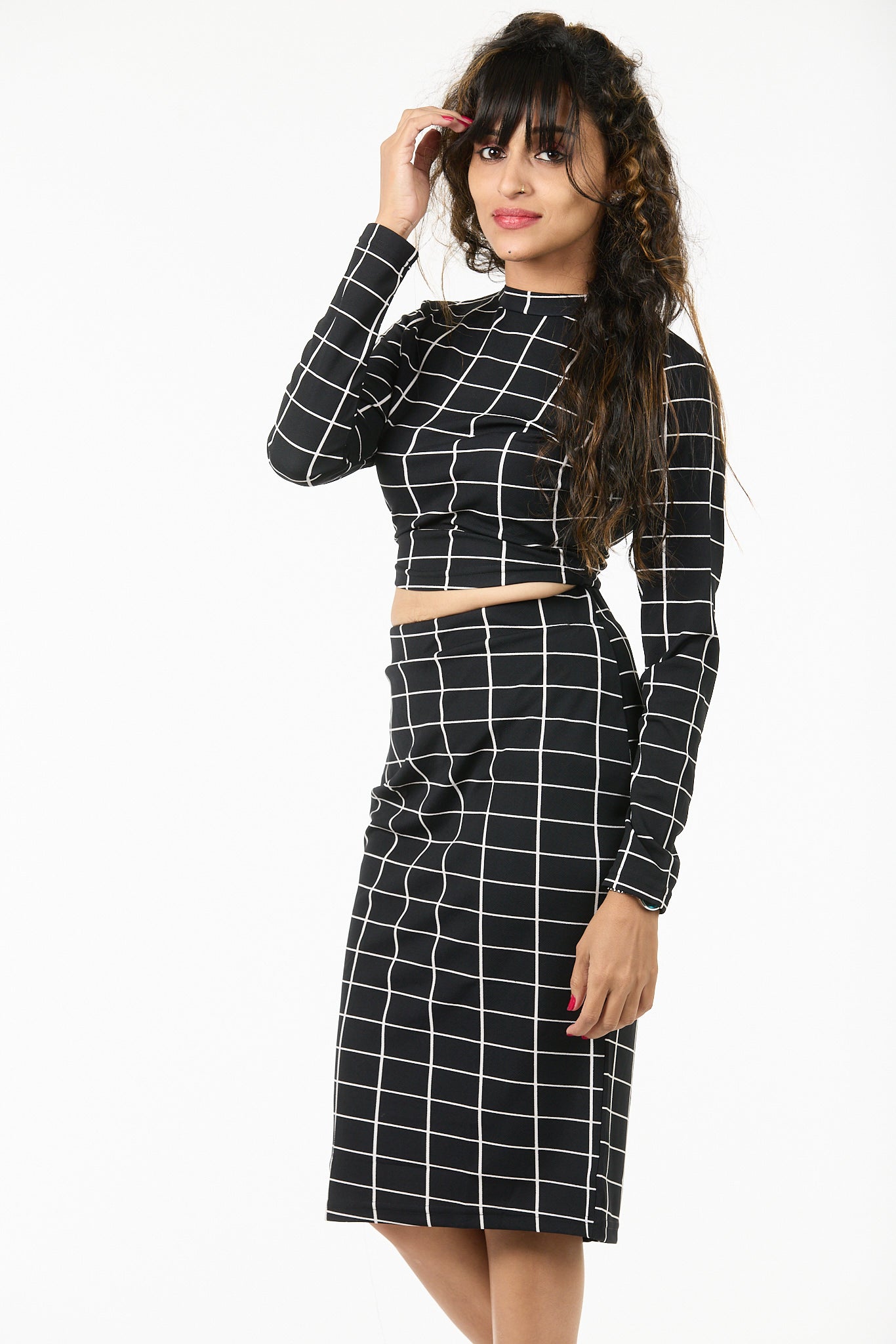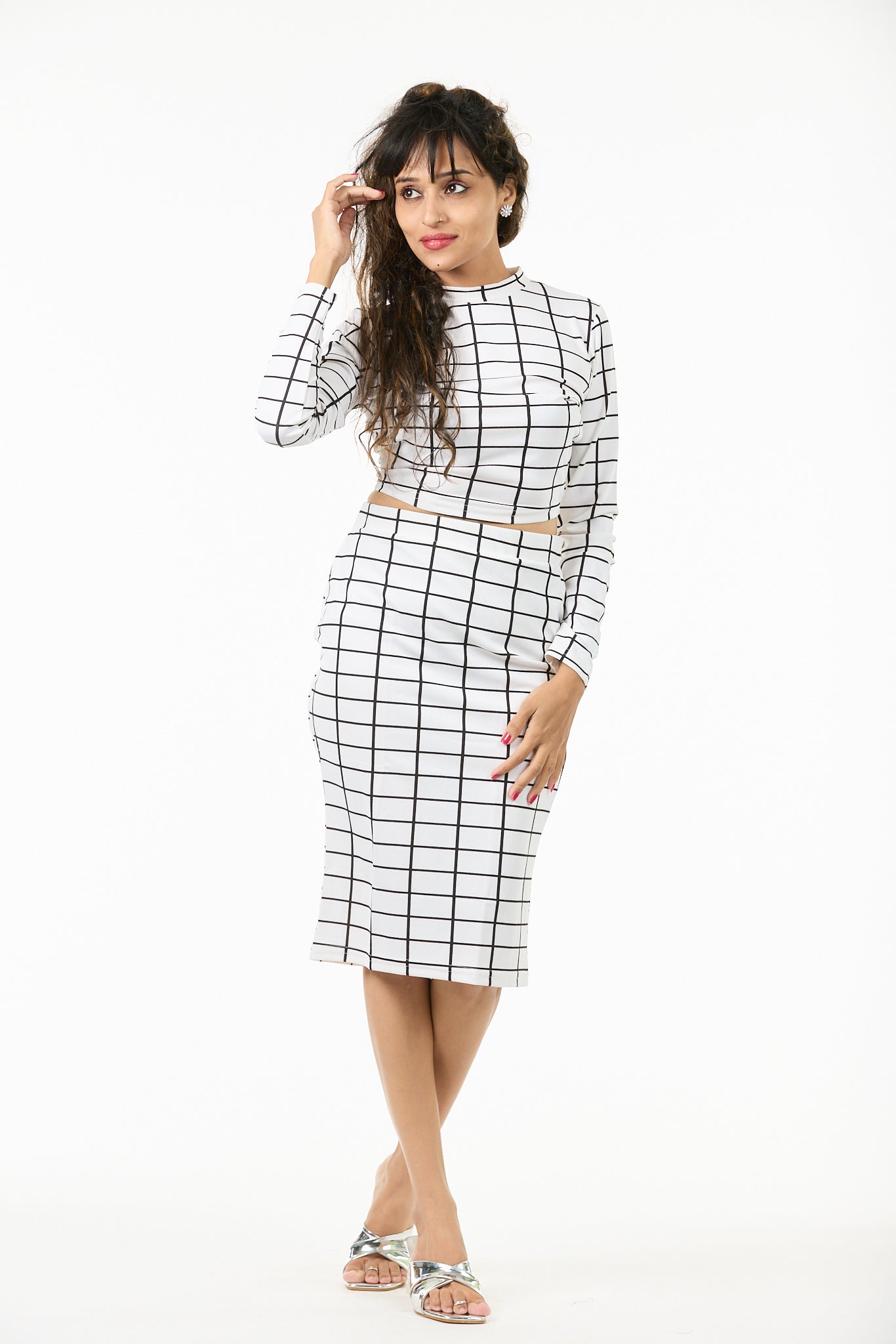 Pull your hair into a sleek ponytail and add a touch of metallic eyeliner — let the grid pattern do the talking while you radiate confidence and modern flair.